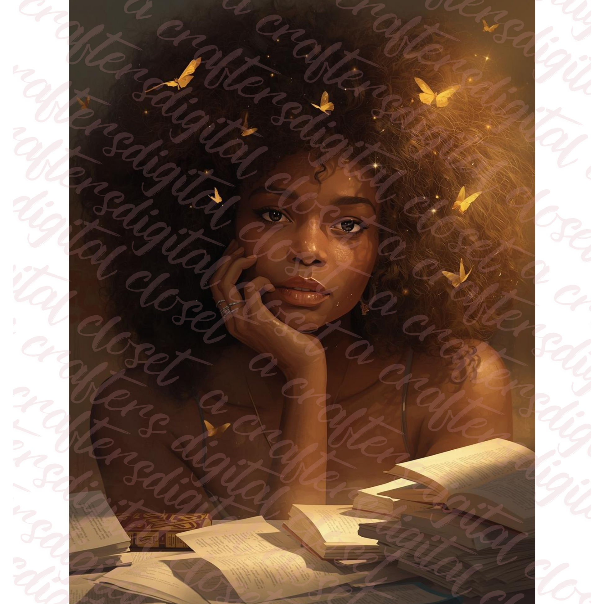 Ignite your creativity and elevate your space with this mesmerizing portrait of a thoughtful African American woman, her curls illuminated with golden butterflies dancing through the air. Surrounded by open books and handwritten notes, she embodies intelligence, curiosity, and the quiet magic of self-discovery.