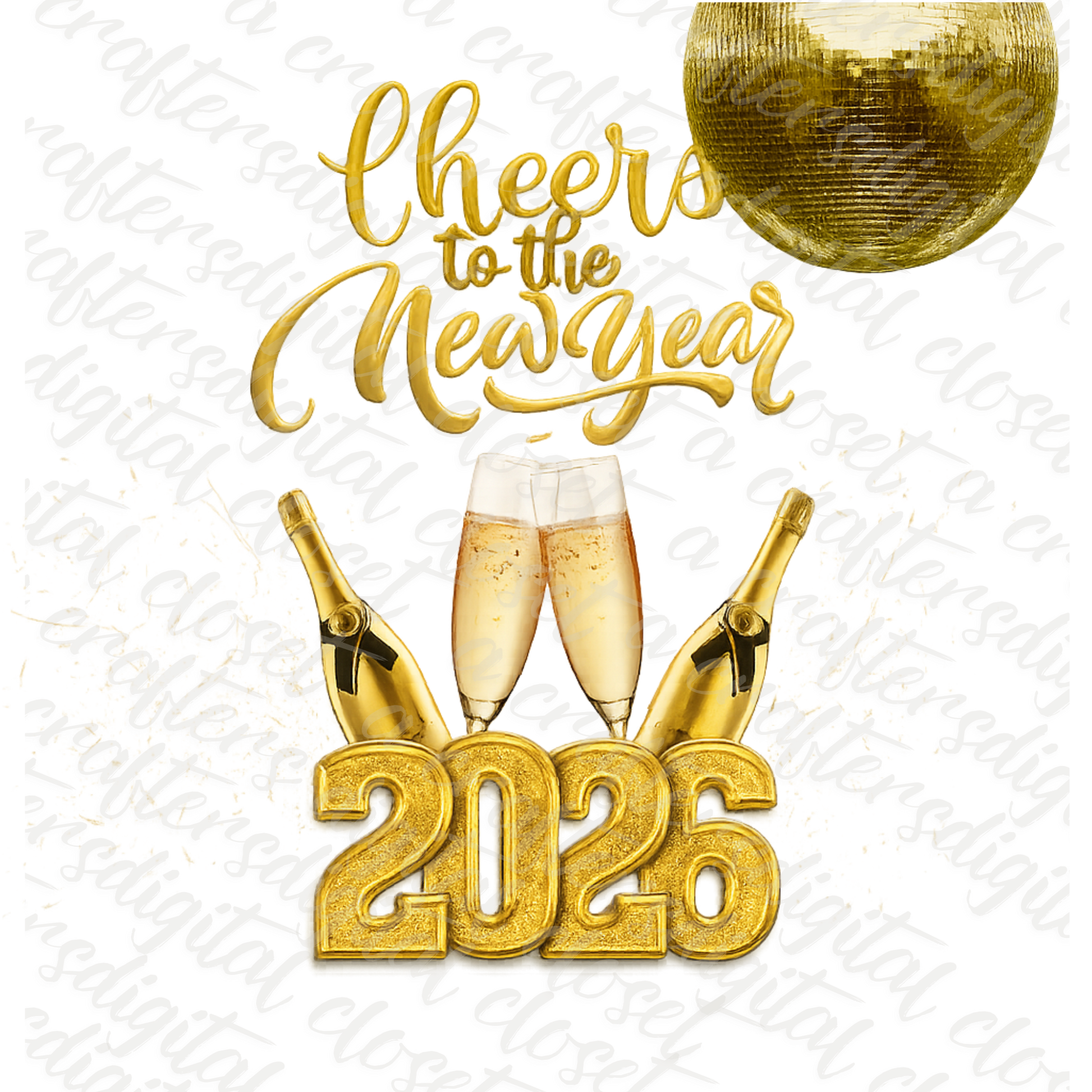 Ring in the new year with timeless elegance using this Cheers to the New Year 2026 Digital Design. Featuring rich gold tones, a shimmering disco ball, raised metallic lettering, champagne bottles, and clinking glasses, this design captures the excitement and optimism of welcoming a fresh year in a refined, celebratory style.